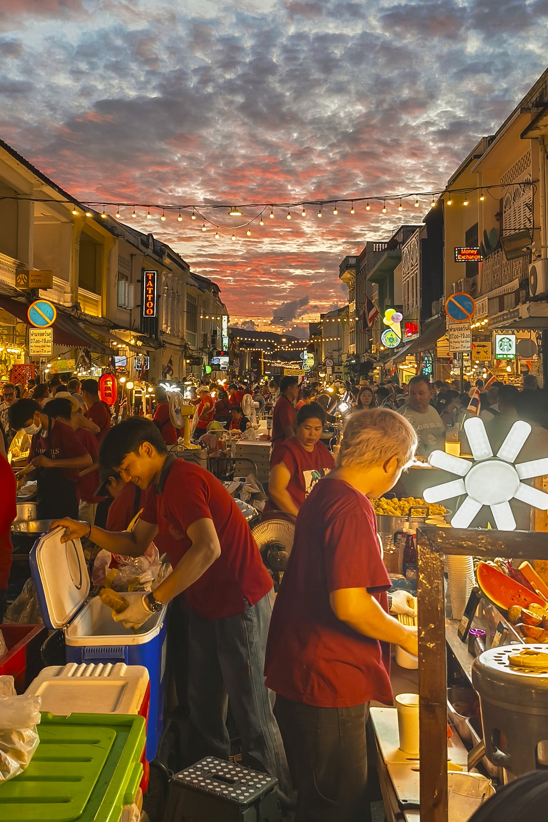Tables overflow with handmade jewellery, vintage curios, and original paintings and prints inspired by Phuket’s landscapes, street scenes and culture. Live portrait sketchers and children’s craft corners add a creative layer.