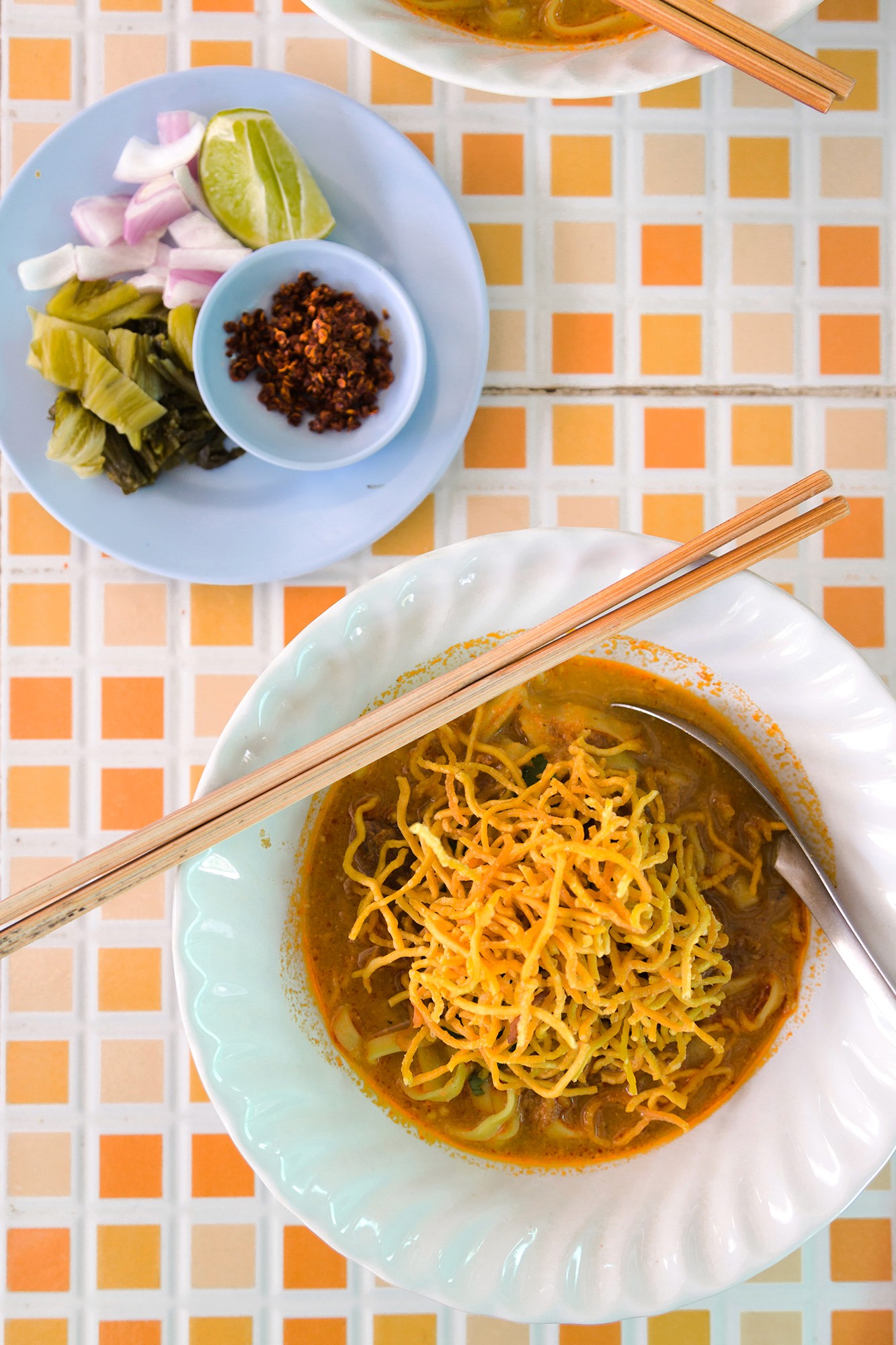 For khao soi, I usually go to Khao Soi Lung Prakit Kad Kom. This one is no secret. Owner Loong Prakit has been featured on a few Netflix shows, and his food (50 to 70 baht) definitely lives up to the hype.