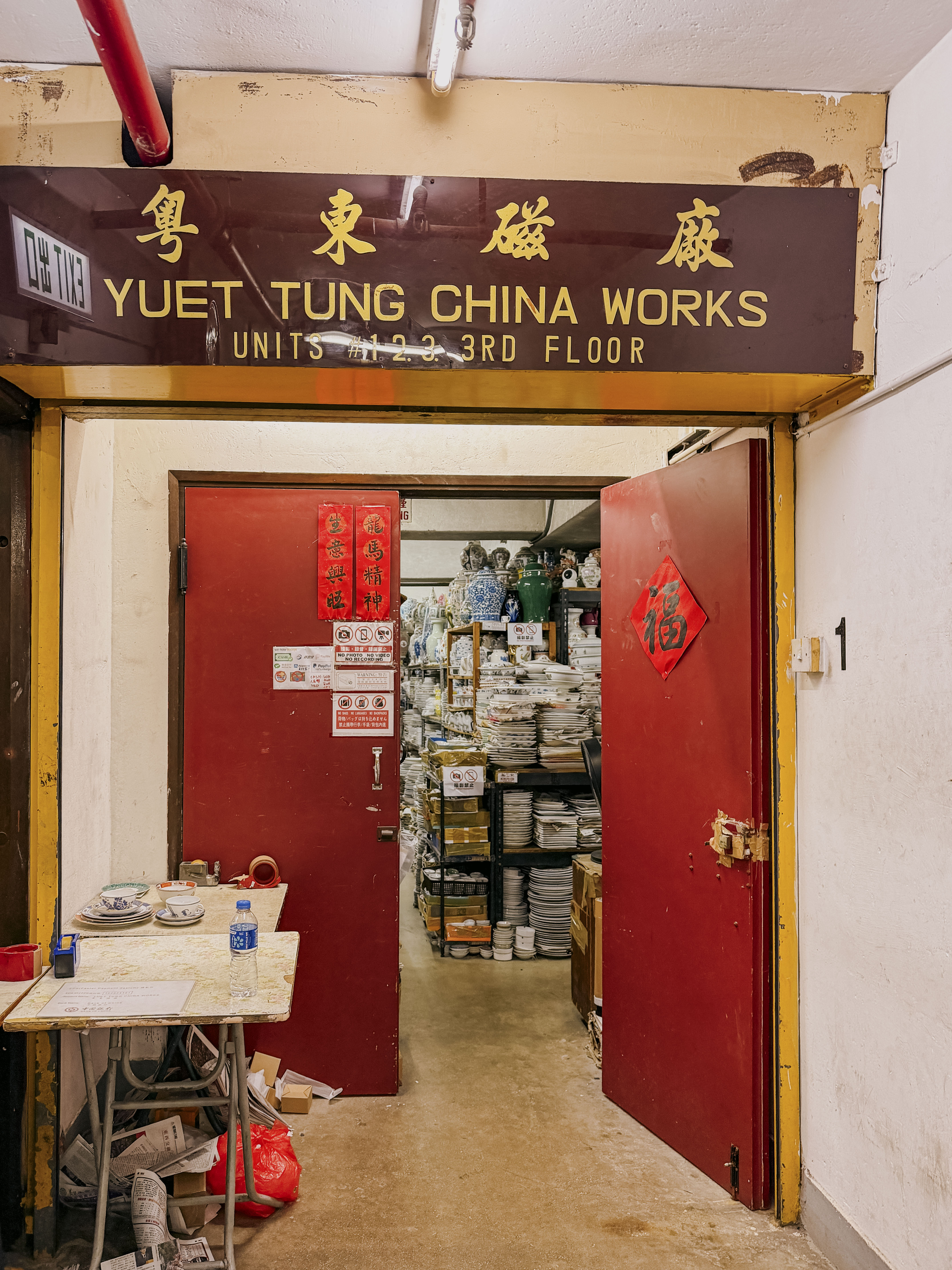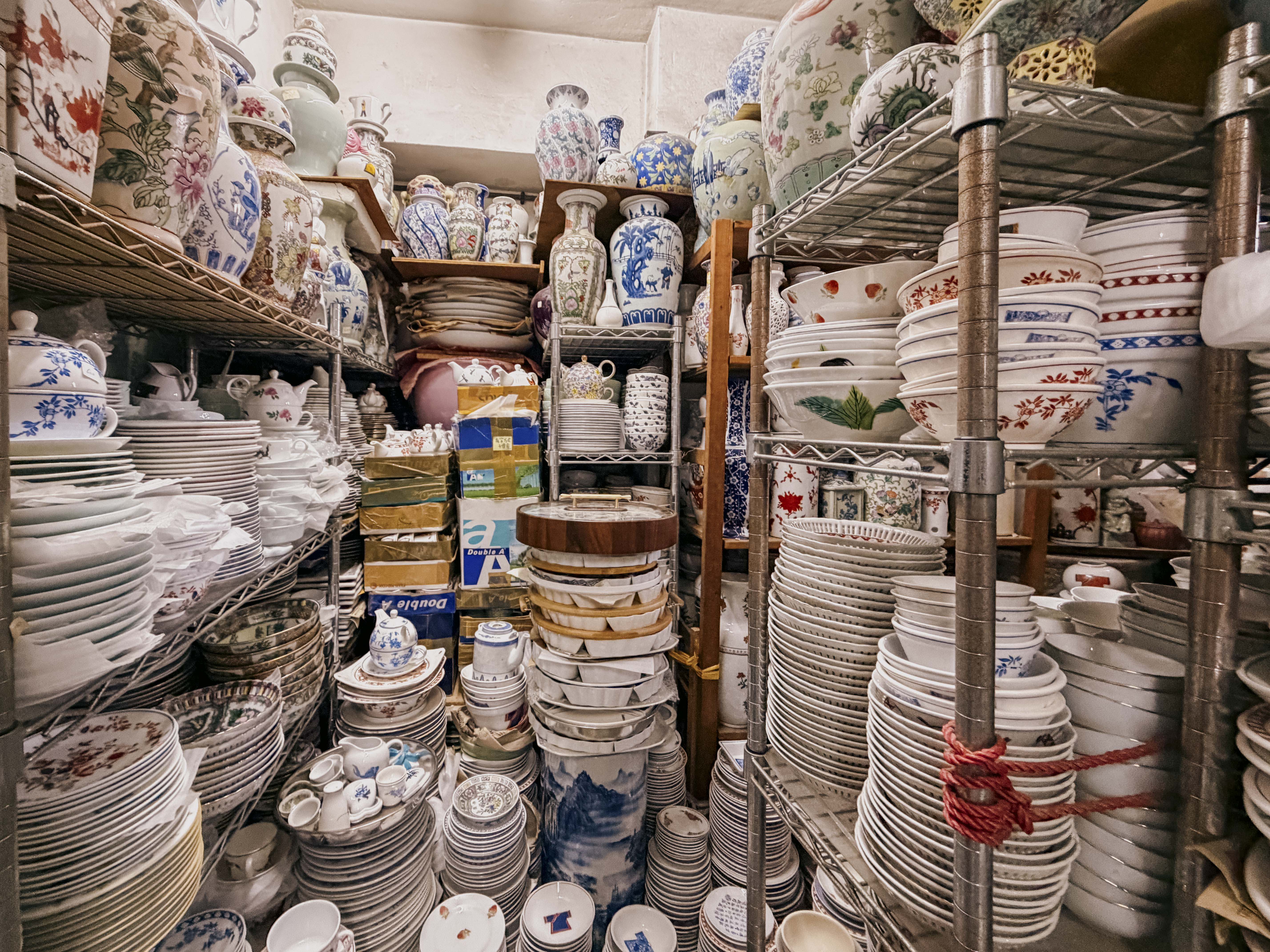 Yuet Tung China Works is tucked away in an industrial building in Kowloon Bay, a no-frills space stacked floor to ceiling with all types of Hong Kong-made Canton porcelain, from tiny saucers to giant vases and, of course, those familiar rice bowls.