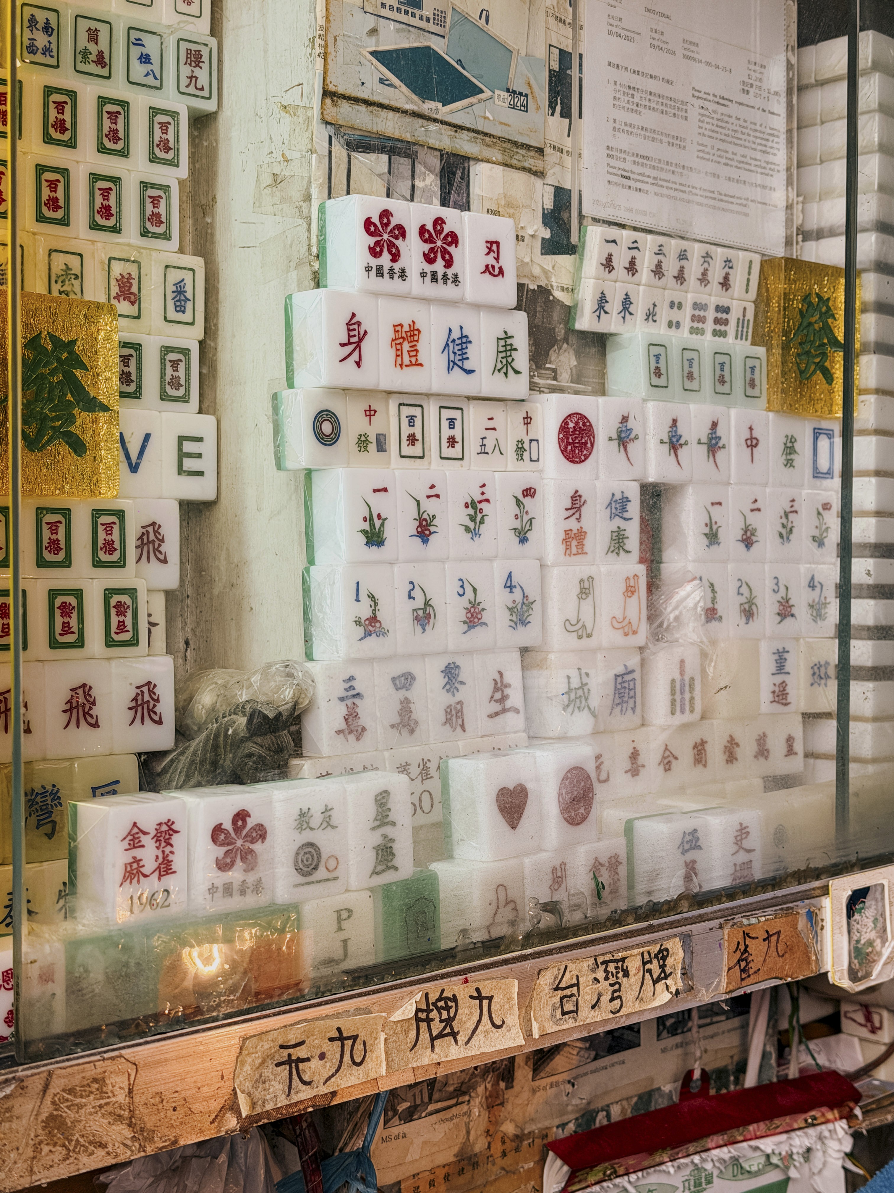 My favourite style of tile is the classic: smooth, glossy rectangles that are bright green on the back and white in front, etched with an elegant Chinese character or pattern in red, green or blue. When I was a child, the tiles were made from bamboo, bone or ivory, but nowadays they’re mostly plastic or acrylic, and mass-produced at a much cheaper price.