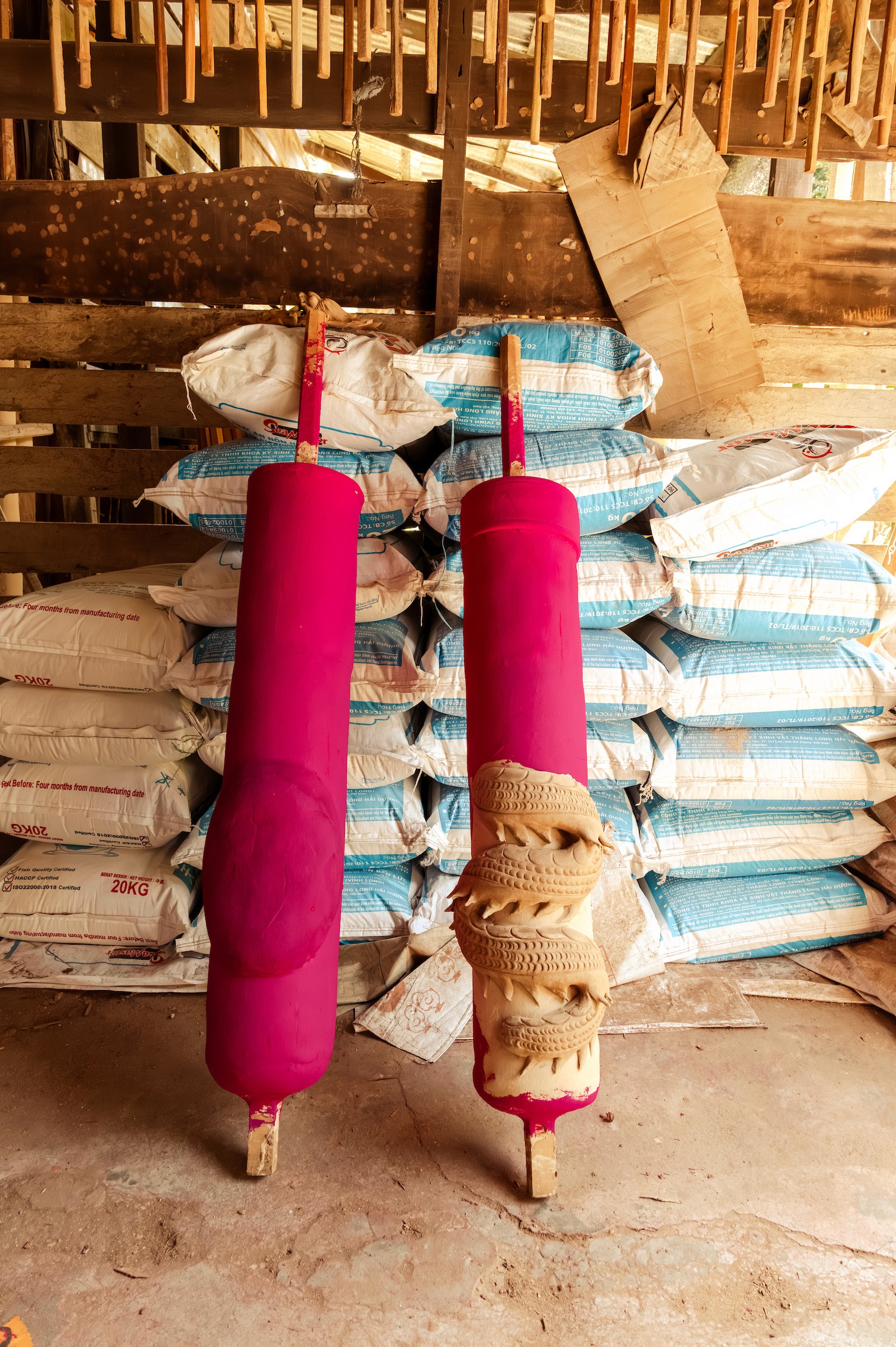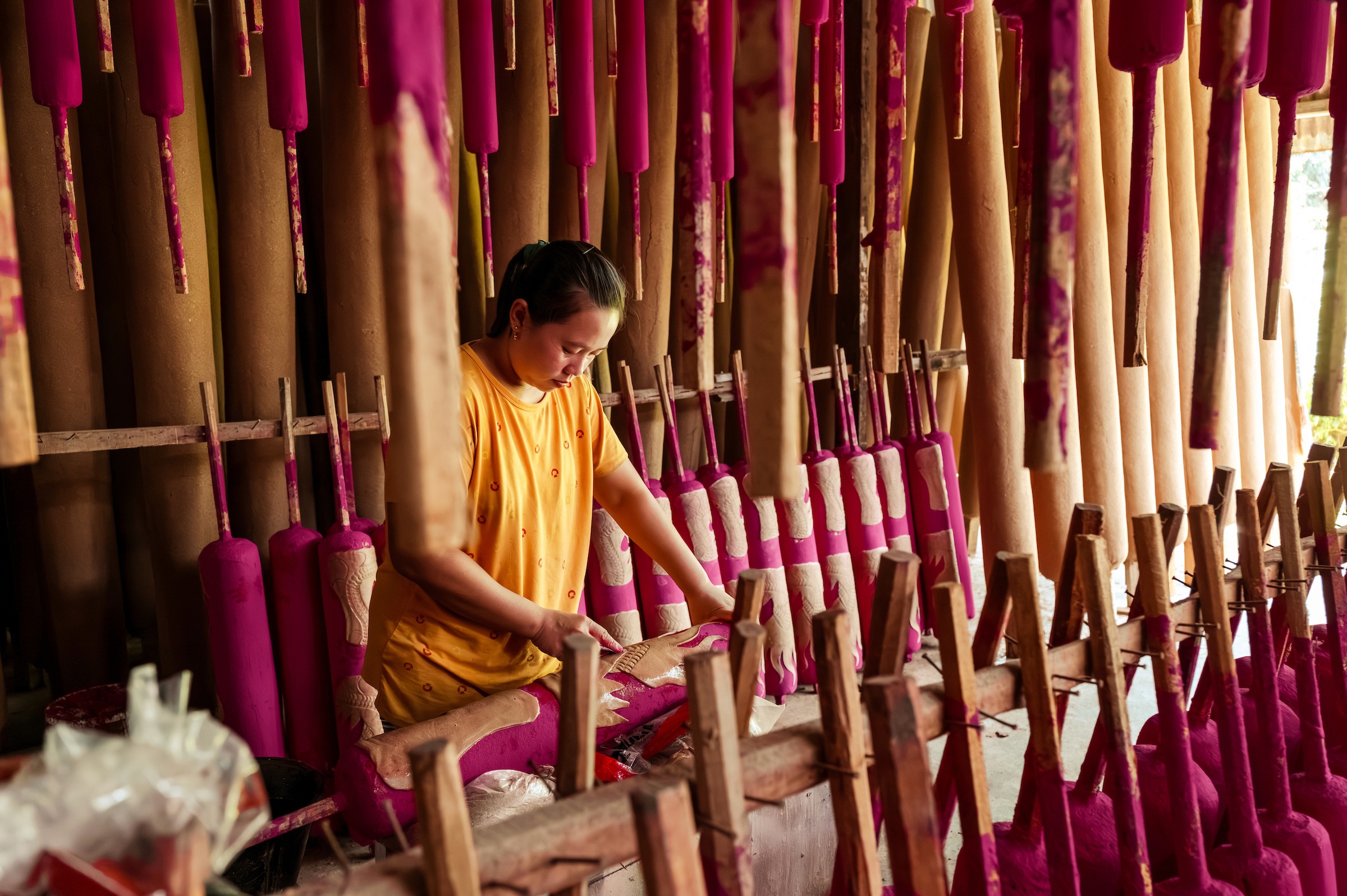 Every joss stick is made with layers of wood glue, wood dust and eucalyptus powder mixed with water. After one layer is applied, it is sun-dried and the process repeated until the layers are thick enough for that design’s purpose. (The thicker a layer is, the longer it burns and the more presence it has visually.) This all takes place with mesmerising flow and precision, highlighting a pursuit that demands patience as much as skill, and is steered by nothing – no guidelines, no templates – but memory.