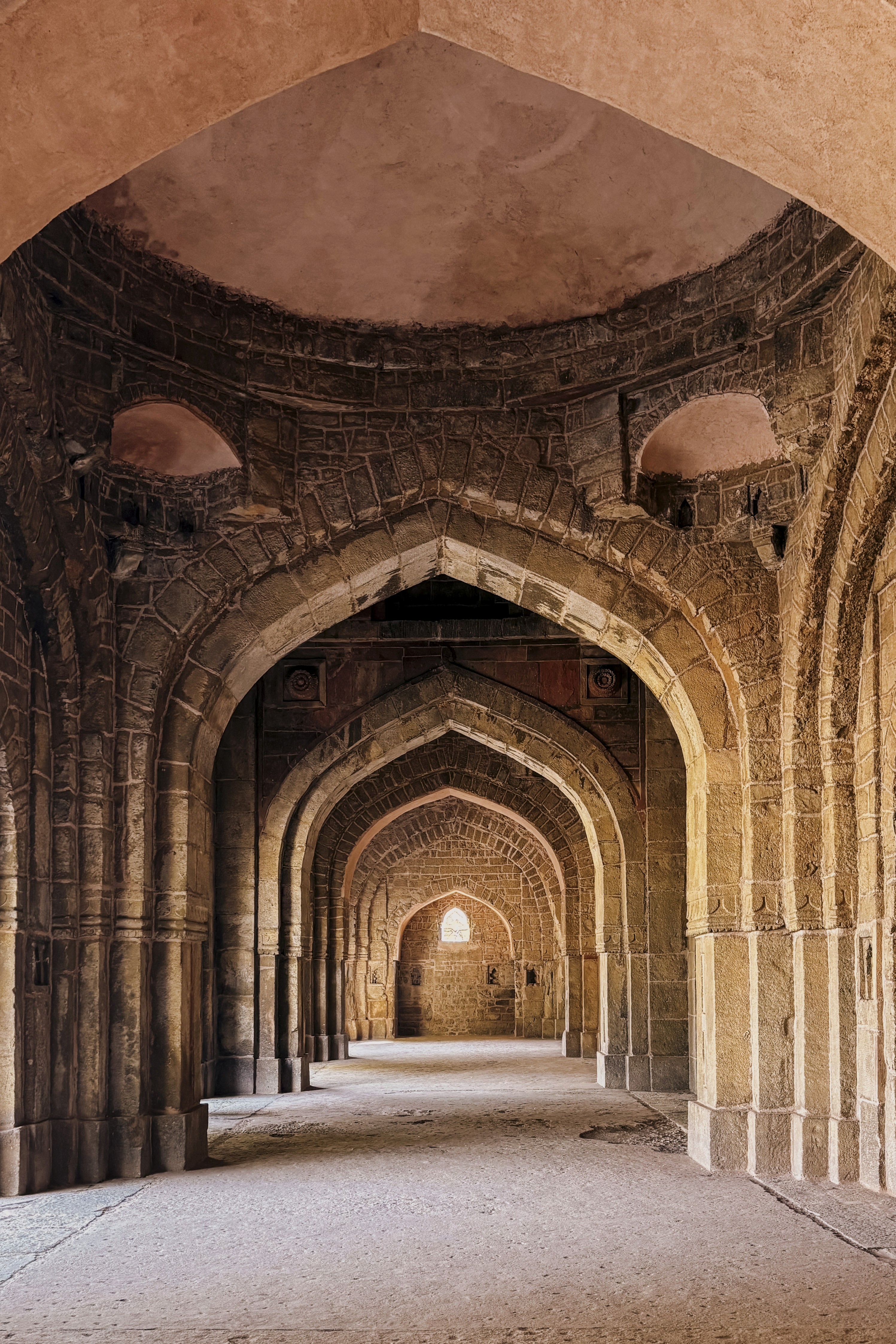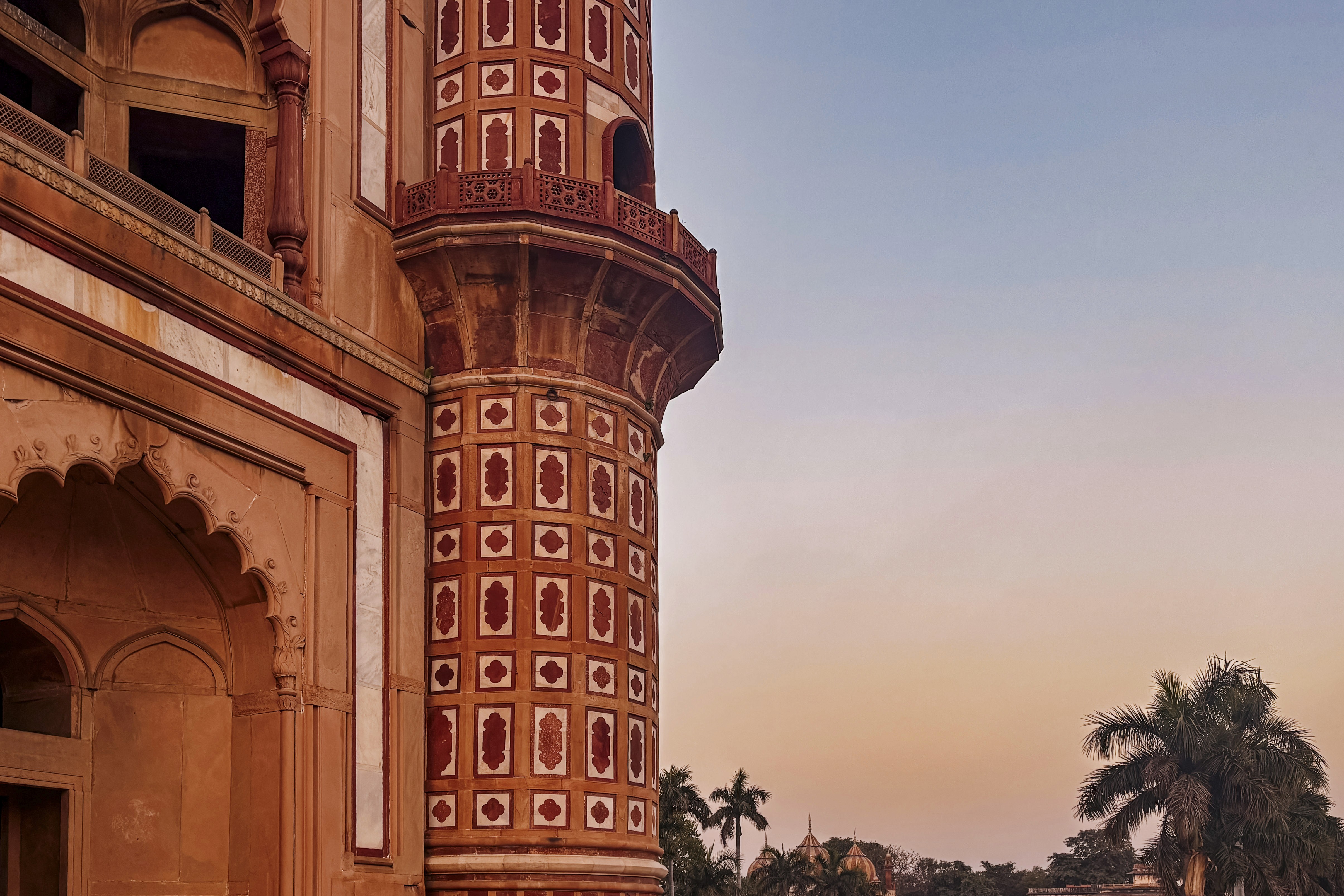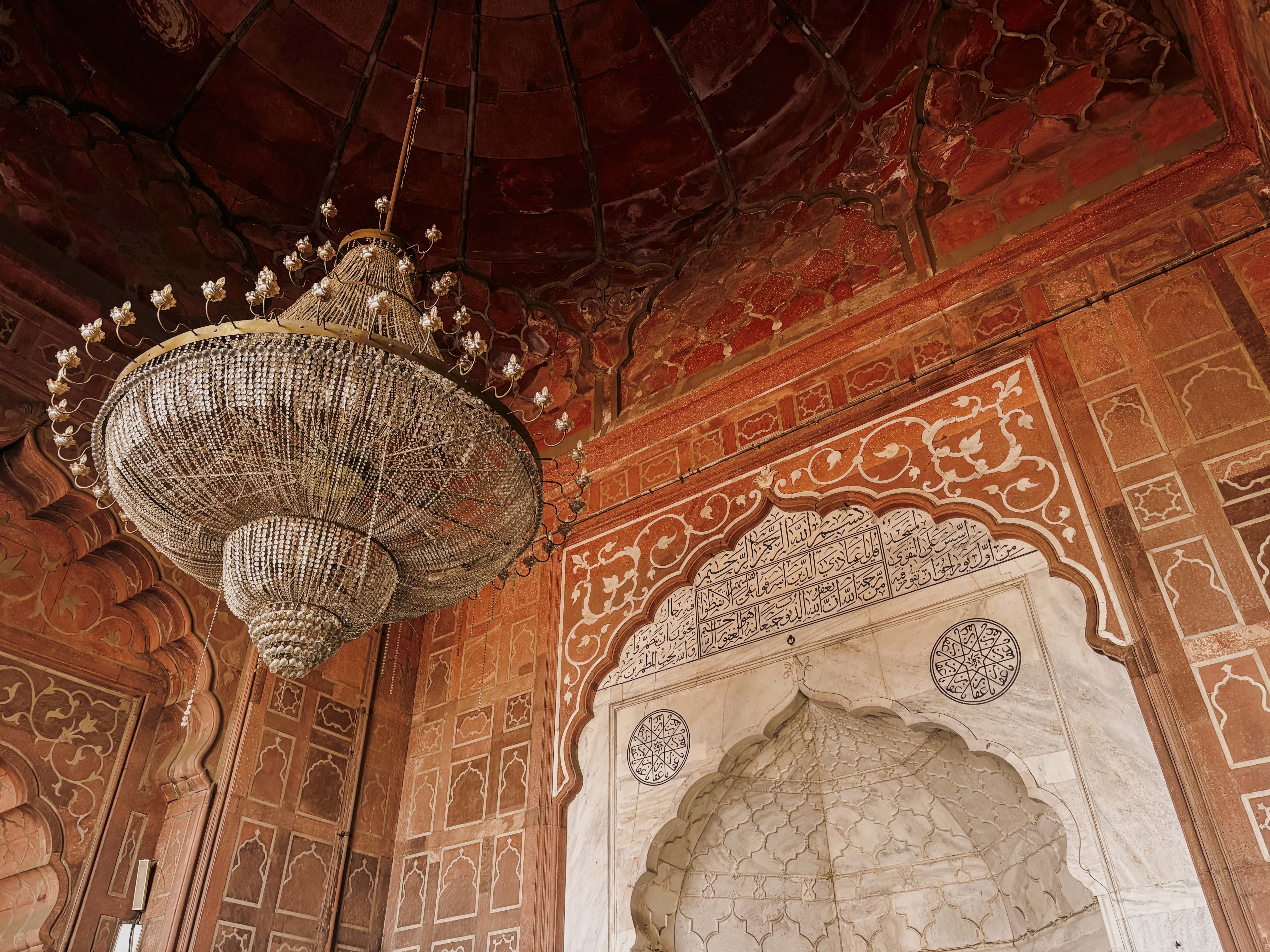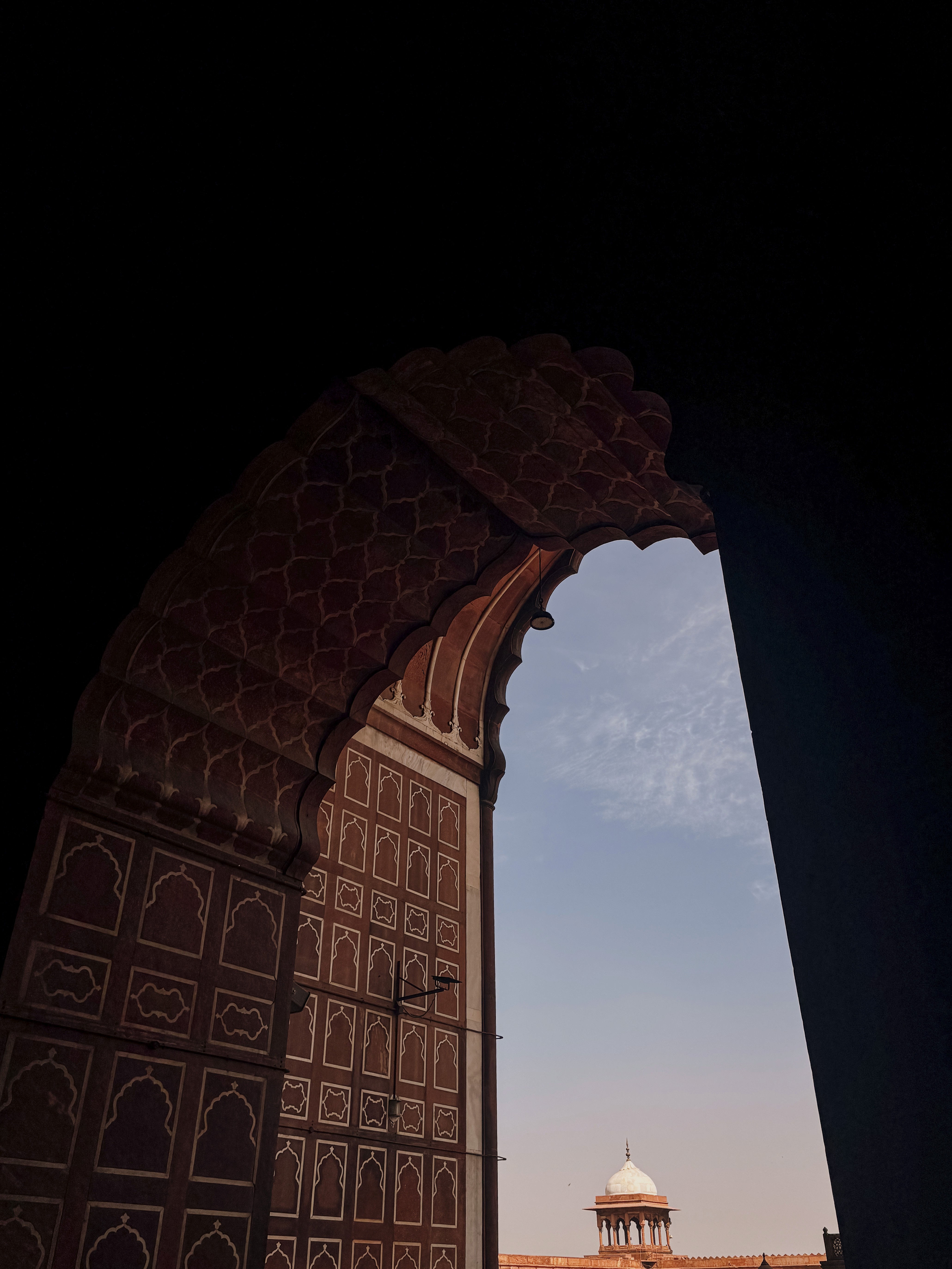 Their tomb stands within a mosque complex built between 1528 and 1529, its red sandstone blushing against blue sky. Above, a circular ceiling in muted reds and blues is adorned with carved sunbursts and delicate floral motifs. A band of Jamali’s Persian verses encircles the dome, words that hover between the earthly and the divine.